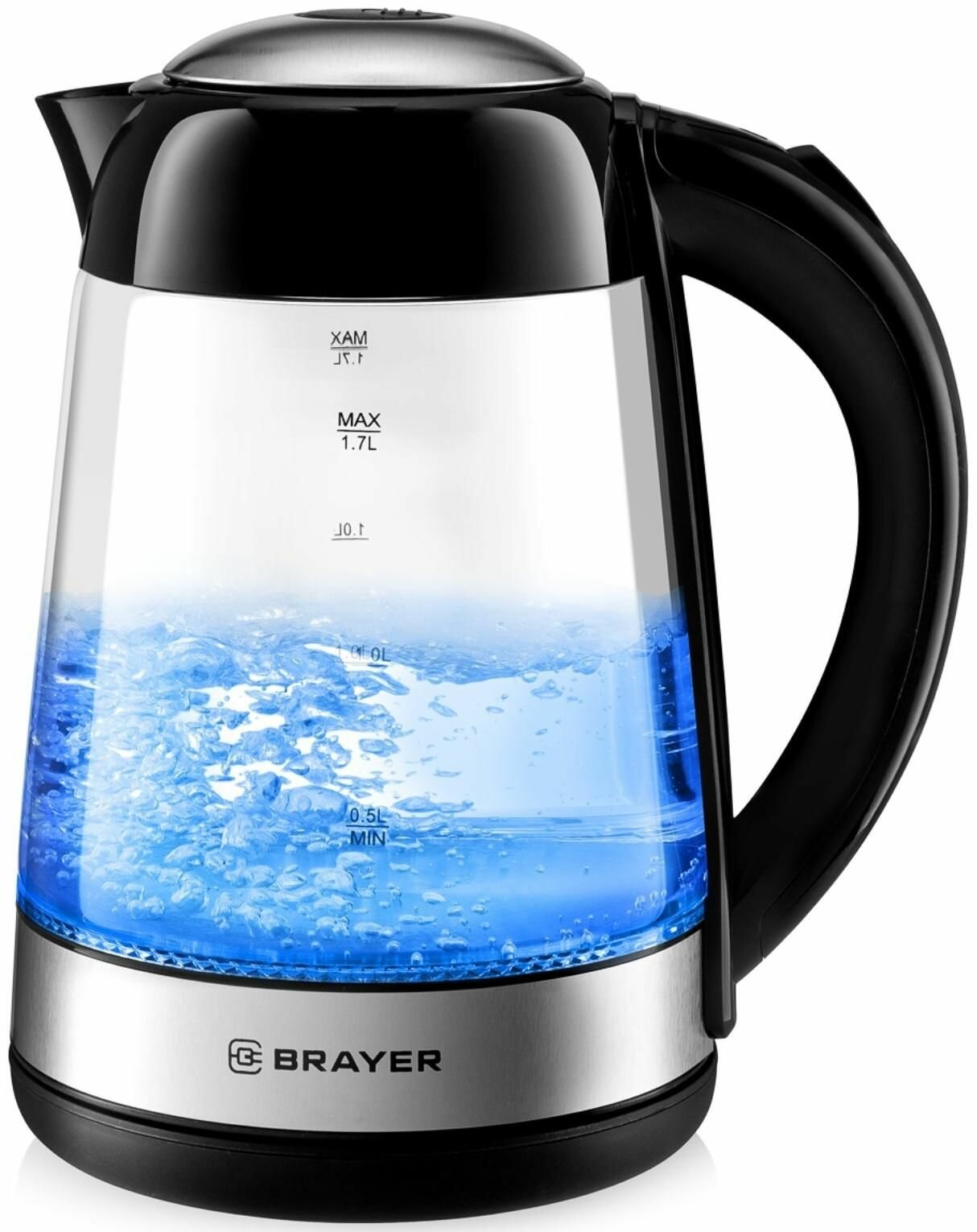 Чайник электрический BRAYER BR1012BK, стекло, 1.7 л, 2200 Вт, чёрно-серебристый
