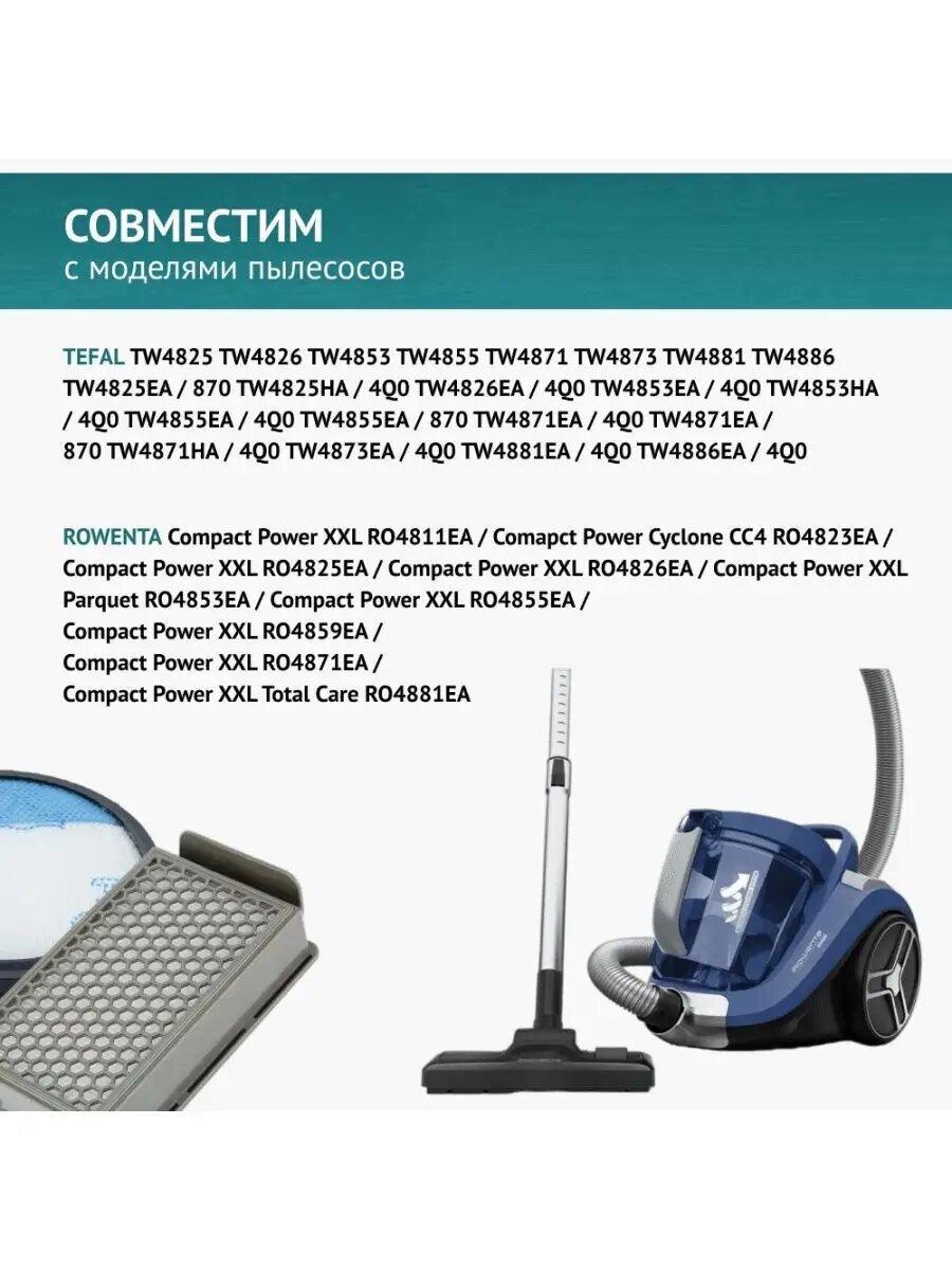 | Совместимые модели | Rowenta Compact Power XXL RO4811EA Rowenta Comapct Power Cyclone CC4 RO4823EA Rowenta Compact Power XXL RO4825EA Rowenta Compact Power XXL RO4826EA Rowenta Compact Power XXL Parquet RO4853EA Rowenta Compact Power XXL RO4855EA Rowenta Compact Power XXL RO4859EA Rowenta Compact Power XXL RO4871EA Rowenta Compact Power XXL Total Care RO4881EA Tefal TW4825 TW4826 TW4853 TW4855 TW4871 TW4873 TW4881 TW4886 TW4825EA / 870 TW4825HA / 4Q0 TW4826EA / 4Q0 TW4853EA / 4Q0 TW4853HA / 4Q0 TW4855EA / 4Q0 TW4855EA / 870 TW4871EA / 4Q0 TW4871EA / 870 TW4871HA / 4Q0 TW4873EA / 4Q0 TW4881EA / 4Q0 TW4886EA / 4Q0 |