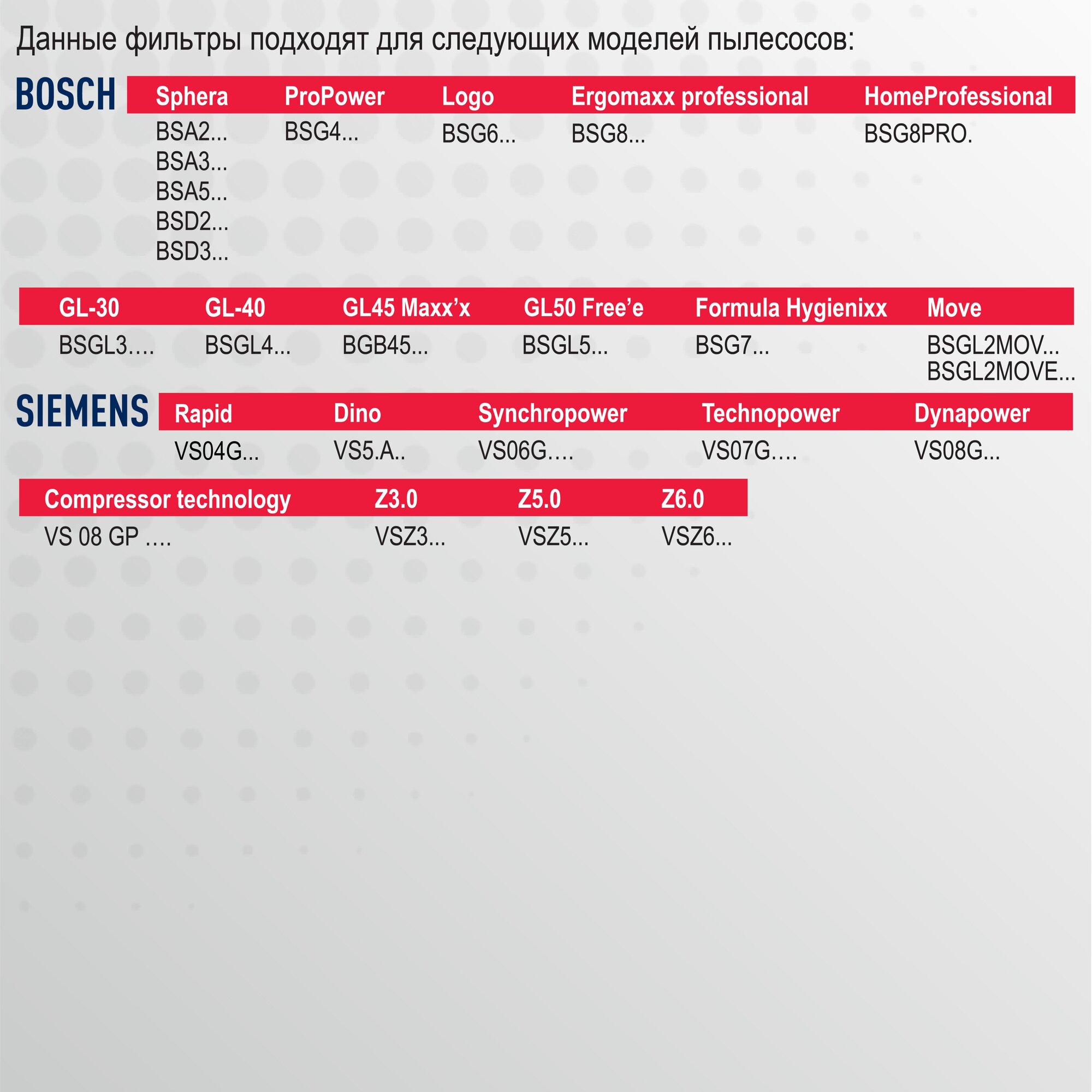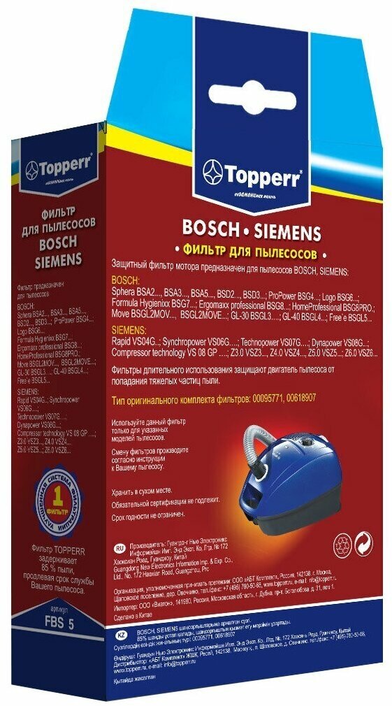| Совместимые модели | BOSCH: Sphera BSA2..., BSA3..., BSA5..., BSD2..., BSD3...; ProPower BSG4...; Logo BSG6...; Formula Hygienixx BSG7...; Ergomaxx professional BSG8...; HomeProfessional BSG8PRO.; Move BSGL2MOV..., BSGL2MOVE...; GL-30 BSGL3….; GL-40 BSGL4...; Free`e BSGL5...; Maxx'x BGL45.., BGB45..; SIEMENS: Rapid VS04G..; Synchropower VS06G….; Technopower VS07G….; Dynapower VS08G...; Compressor technology VS 08 GP ….; Z3.0 VSZ3...; Z4.0 VSZ4...; Z5.0 VSZ5...; Z6.0 VSZ6... |