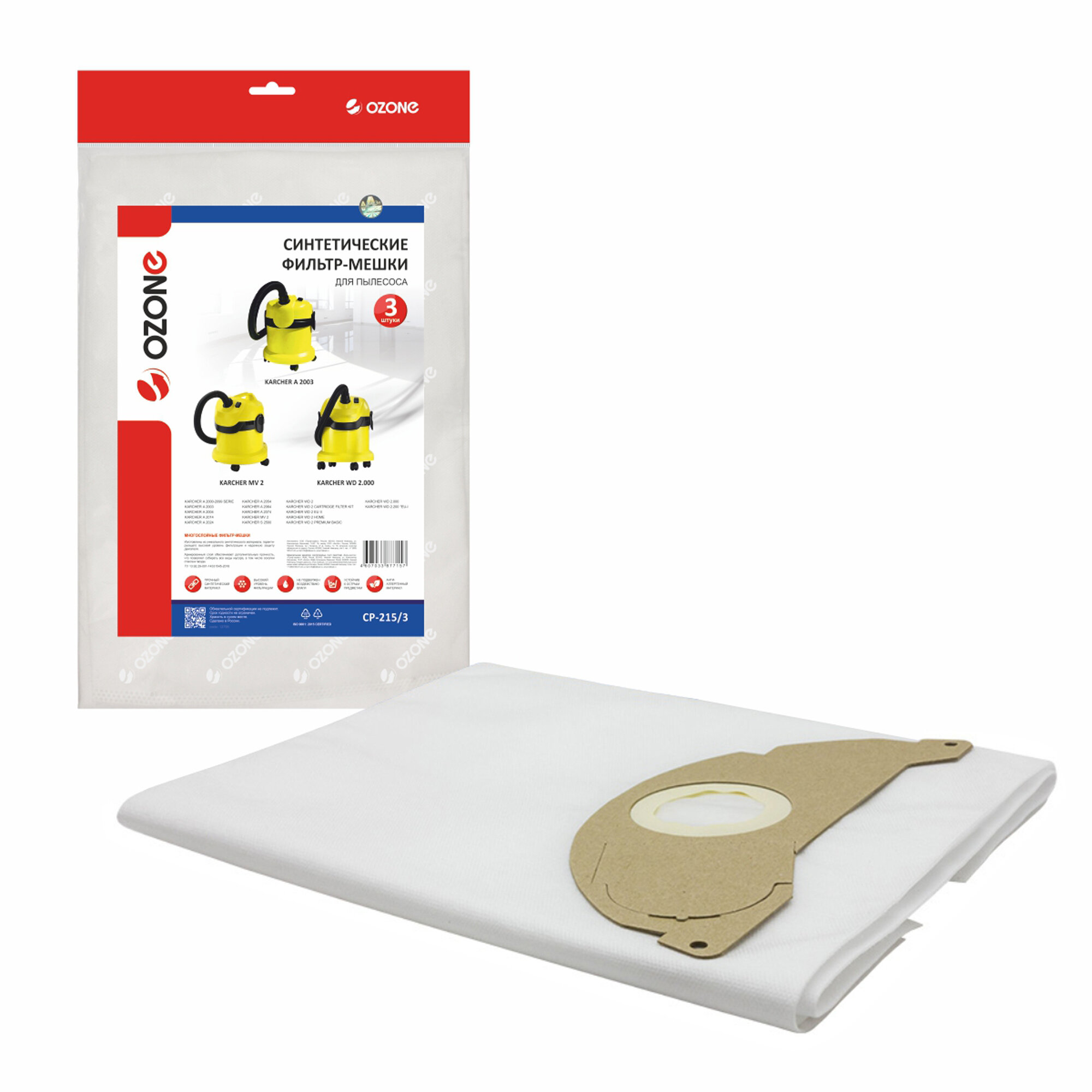 Мешки для пылесоса KARCHER MV 2, WD 2, 3 шт, синтетика, не боятся мокрой пыли, бренд: OZONE, арт. CP-215/3