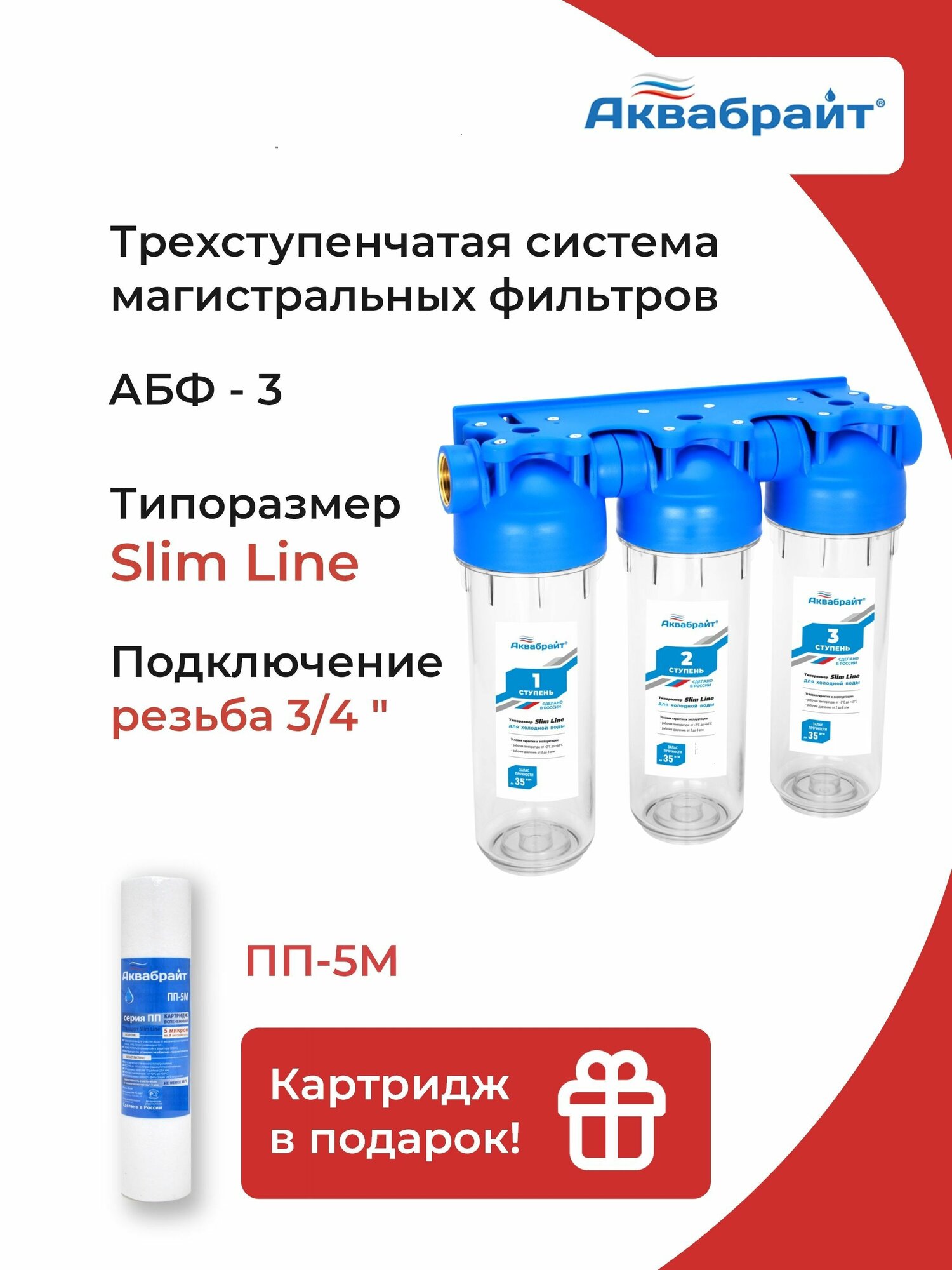 Фильтр магистральный Slim 10" Тройной 3/4" аквабрайт АБФ-3 3/4