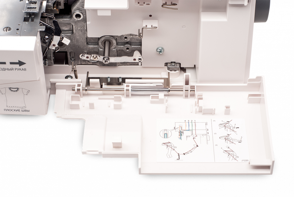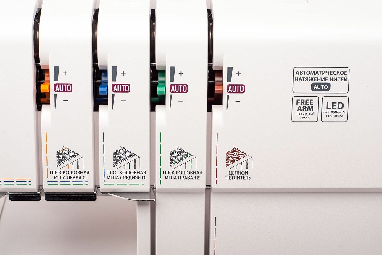 | Плюсы: | Хорошо работает на разных видах трикотажа, от тонкого до объемного. Легкая настройка натяжения нитей. |