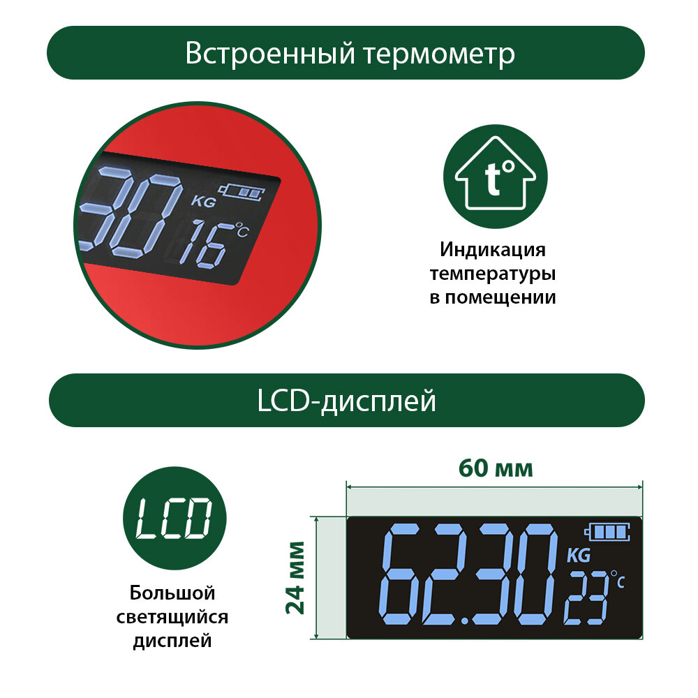 единицы измерения - кг/фунты/стоуны; индикация заряда батареи
