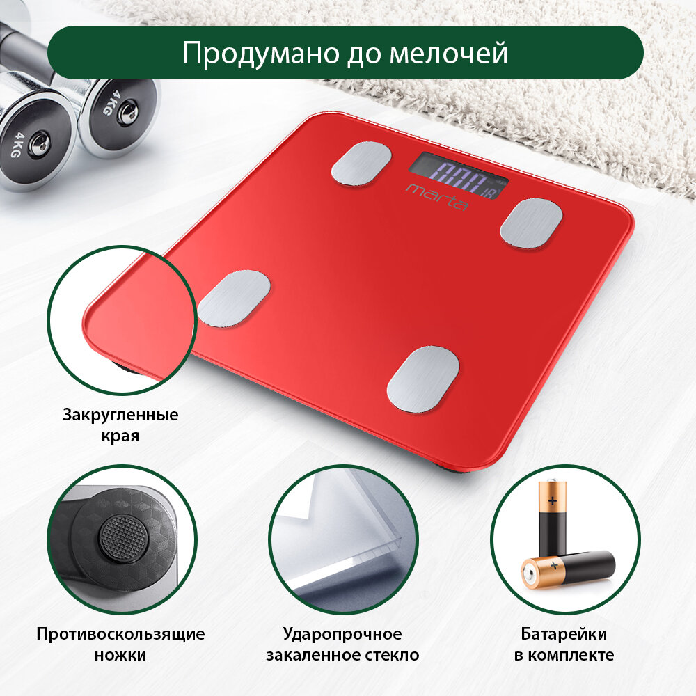 Умные весы MARTA MT-1683, красные, максимальная нагрузка 180кг, синхронизация со смартфоном интересное: