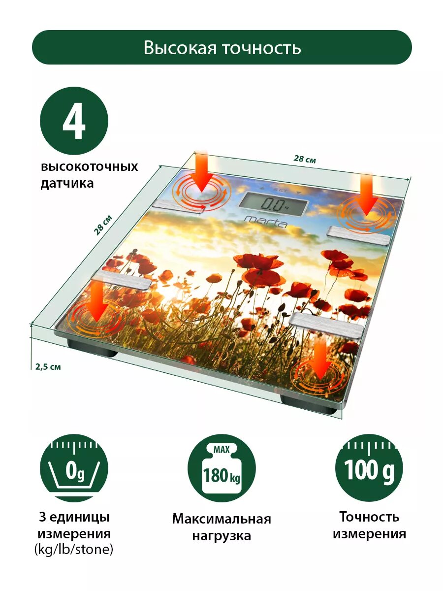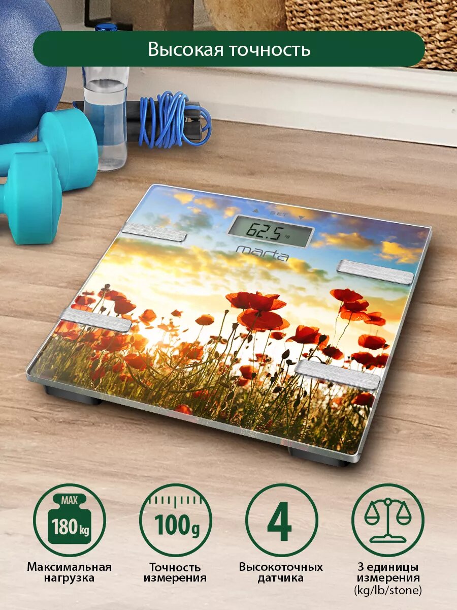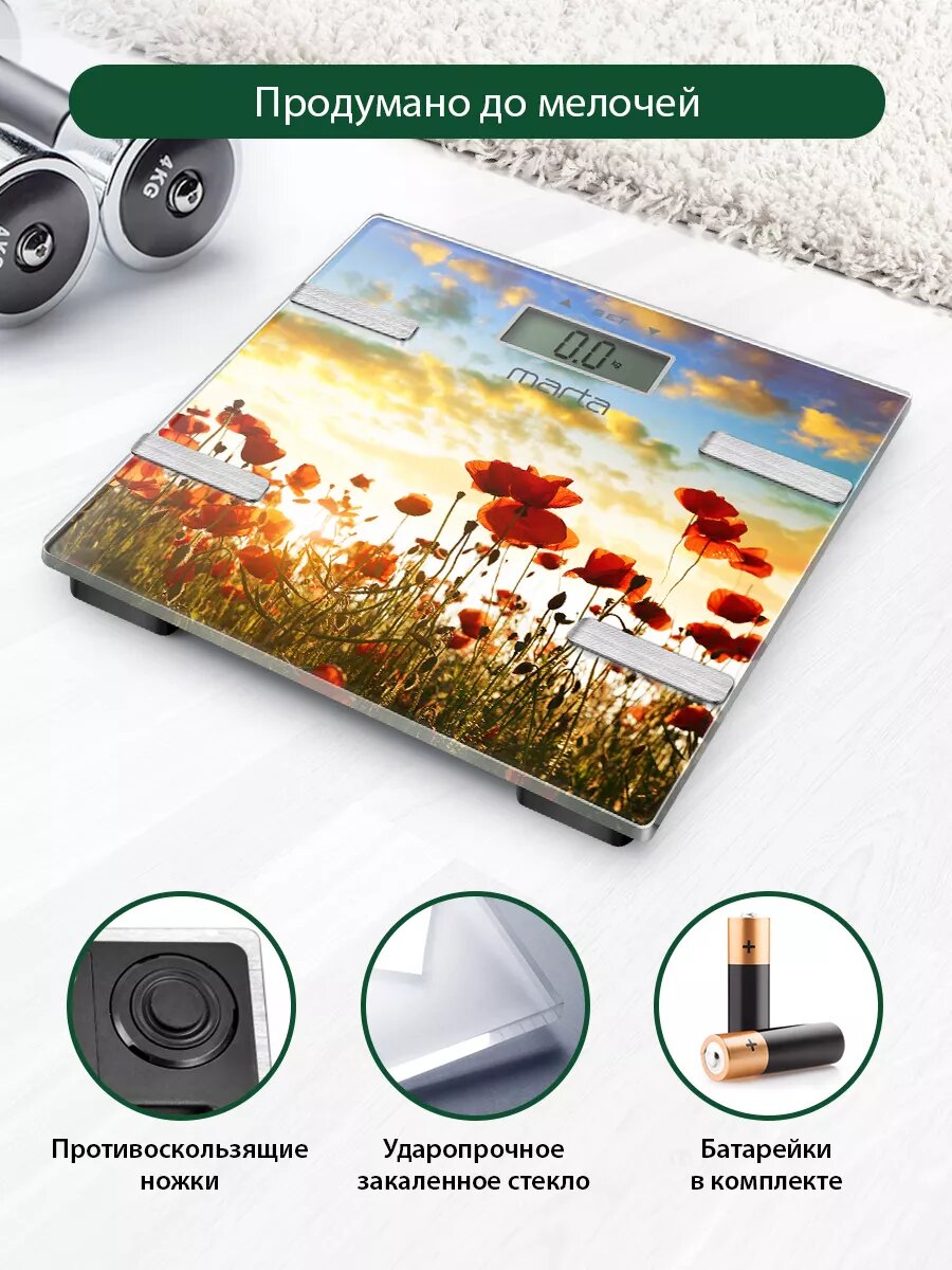 Весы напольные умные MARTA MT-1682 красные маки интересное: