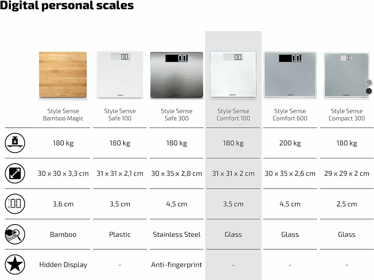 Ниже Вы можете прочитать отзывы на Soehnle Style Sense Comfort 100 Многофункциональные персональные напольные весы до 180 кг из стекла 63853, ознакомится с подробными характеристиками, посмотреть интересные обзоры и фотографии на Soehnle Style Sense Comfort 100 Многофункциональные персональные напольные весы до 180 кг из стекла 63853.