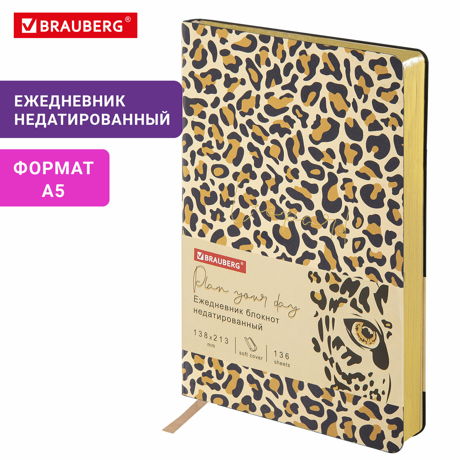 Ежедневник недатированный А5 (138х213 мм), BRAUBERG VISTA, под кожу, гибкий, 136 л., "Leopard", 112038 В комплекте: 1шт.