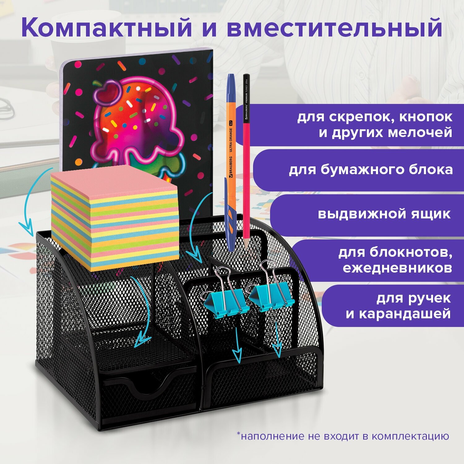 | Плюсы: | Удобный органайзер с отсеками для бумажных блоков, крупной канцелярки, вмещаются даже блокноты. |