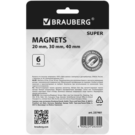Магниты Brauberg мощные, 20 мм-2 шт, 30 мм-2 шт, 40 мм-2 шт, серые, Super (237481)