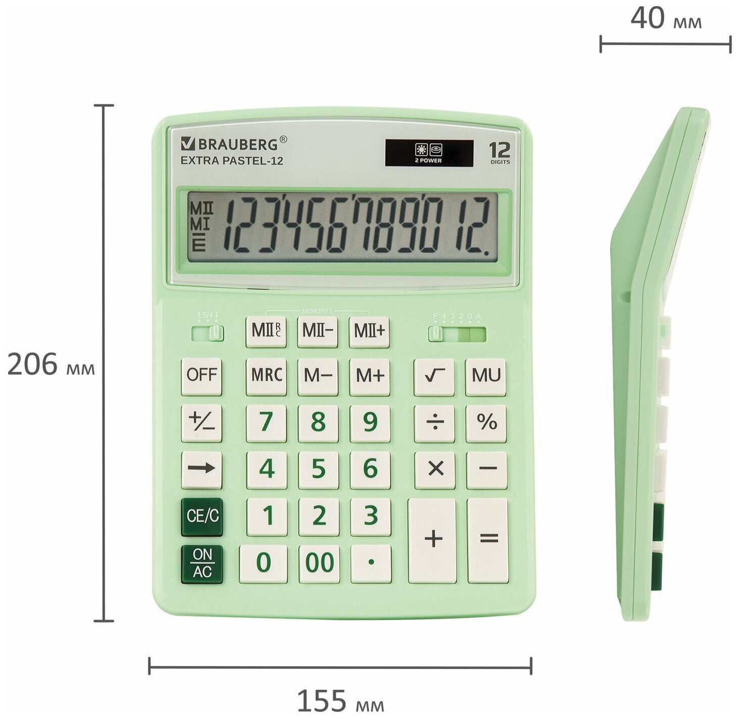 Калькулятор настольный Brauberg Extra Pastel-12-LG, 12 разрядов, двойное питание, мятный (250488)