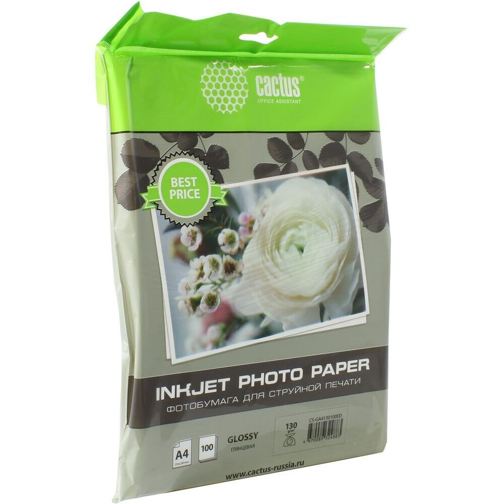 Фотобумага Cactus CS-GA4130100ED, A4, для струйной печати, 100л, 130г/м2, белый, покрытие глянцевое