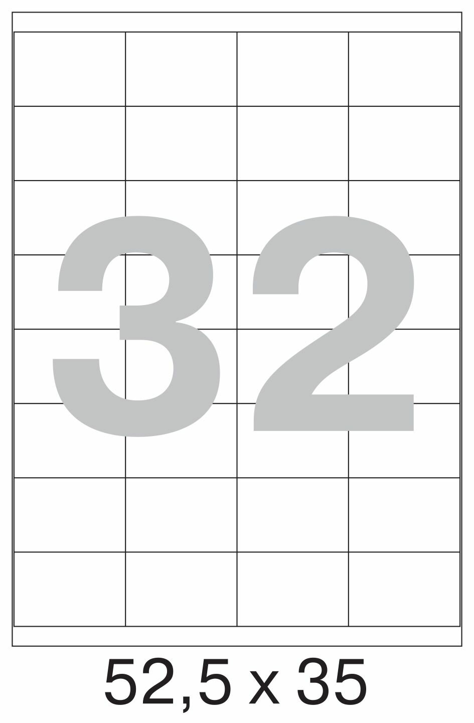 | Дополнительная информация | размер этикетки, см.: 5,25х3,5; кол-во этикеток на листе: 32; верхнее поле, см: 0,85; боковые поля, см: 0; шаг по вертикали, см: 3,5; шаг по горизонтали, см: 5,25; высота наклейки, см: 3,5; ширина наклейки, см.: 5,25; число наклеек по горизонтали: 4; число наклеек по вертикали: 8. |