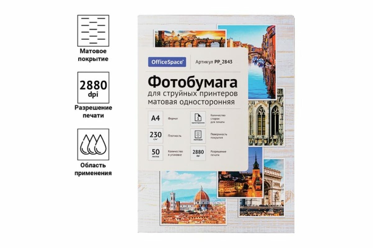 Фотобумага OfficeSpace для струйных принтеров, А4, 50 листов, матовая, односторонняя, 230 г/м2 (PP_2843)