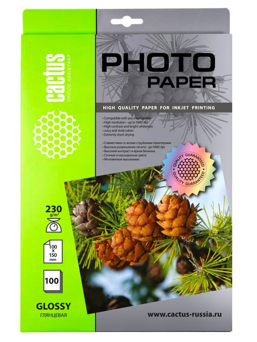 Фотобумага Cactus CS-GA6230100, глянцевая, 10х15, 230 г/м2, 100 листов