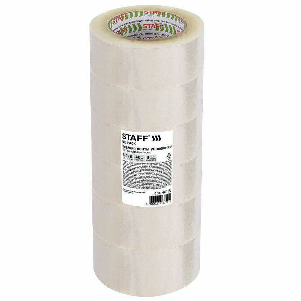 Клейкие ленты STAFF упаковочные 48 мм х 120 м, комплект 6 шт., прозрачные, 40 микрон, BIG PACK, 440180