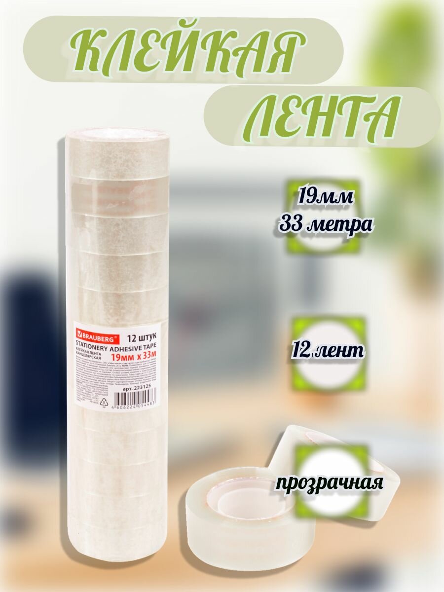 Скотч Brauberg, прозрачный, матовый, офисный, длина 33 м, ширина 12 мм, 12 штук