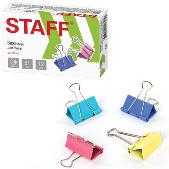 Зажимы для бумаг STAFF, комлпект 12 шт., 51 мм, на 230 листов, цветные, картонная коробка, 225160
