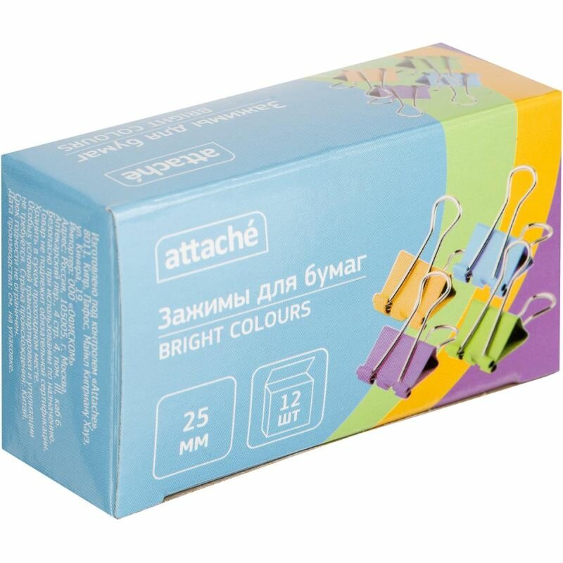 Зажимы для бумаг Attache "Bright Colours", цветные, 25 мм, в картонной коробке, 12 шт