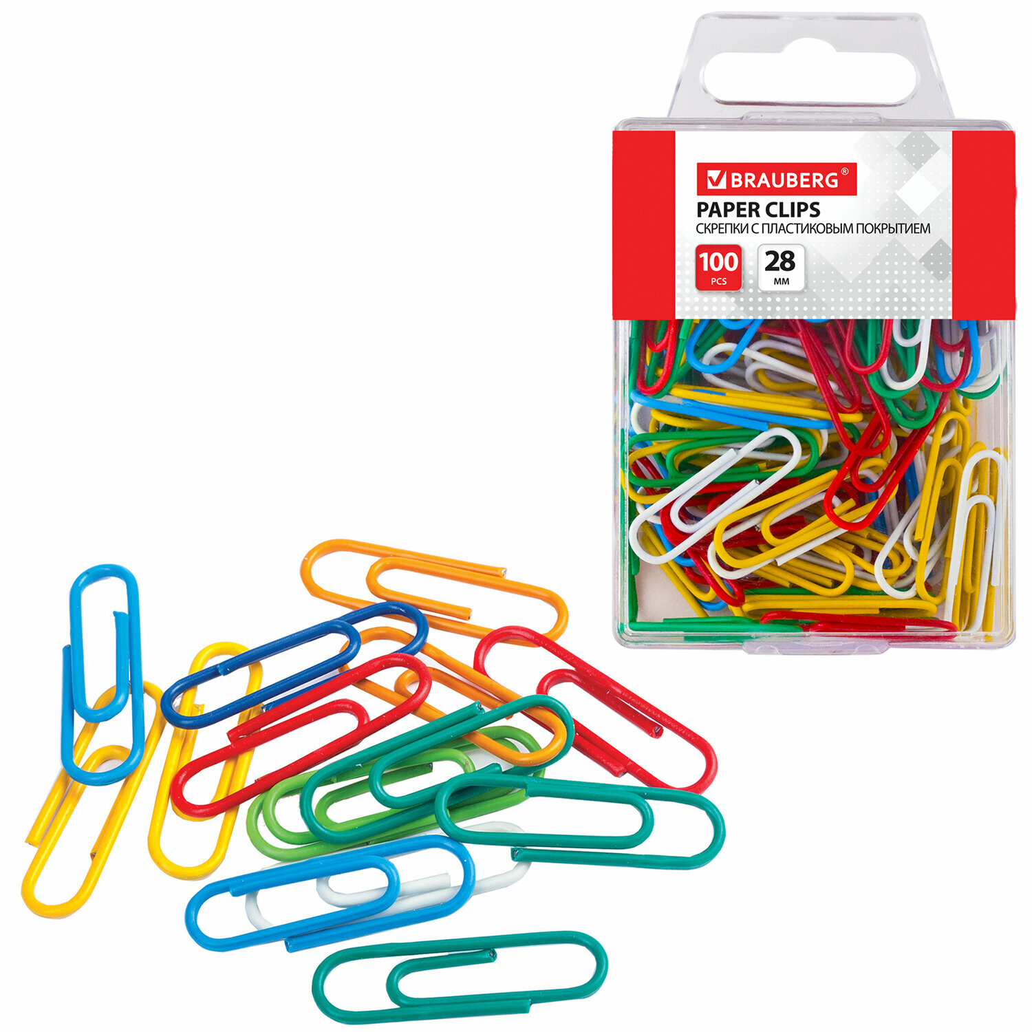 Скрепки BRAUBERG, 28 мм, цветные, 100 шт., в пластиковой коробке, 221111, 221111