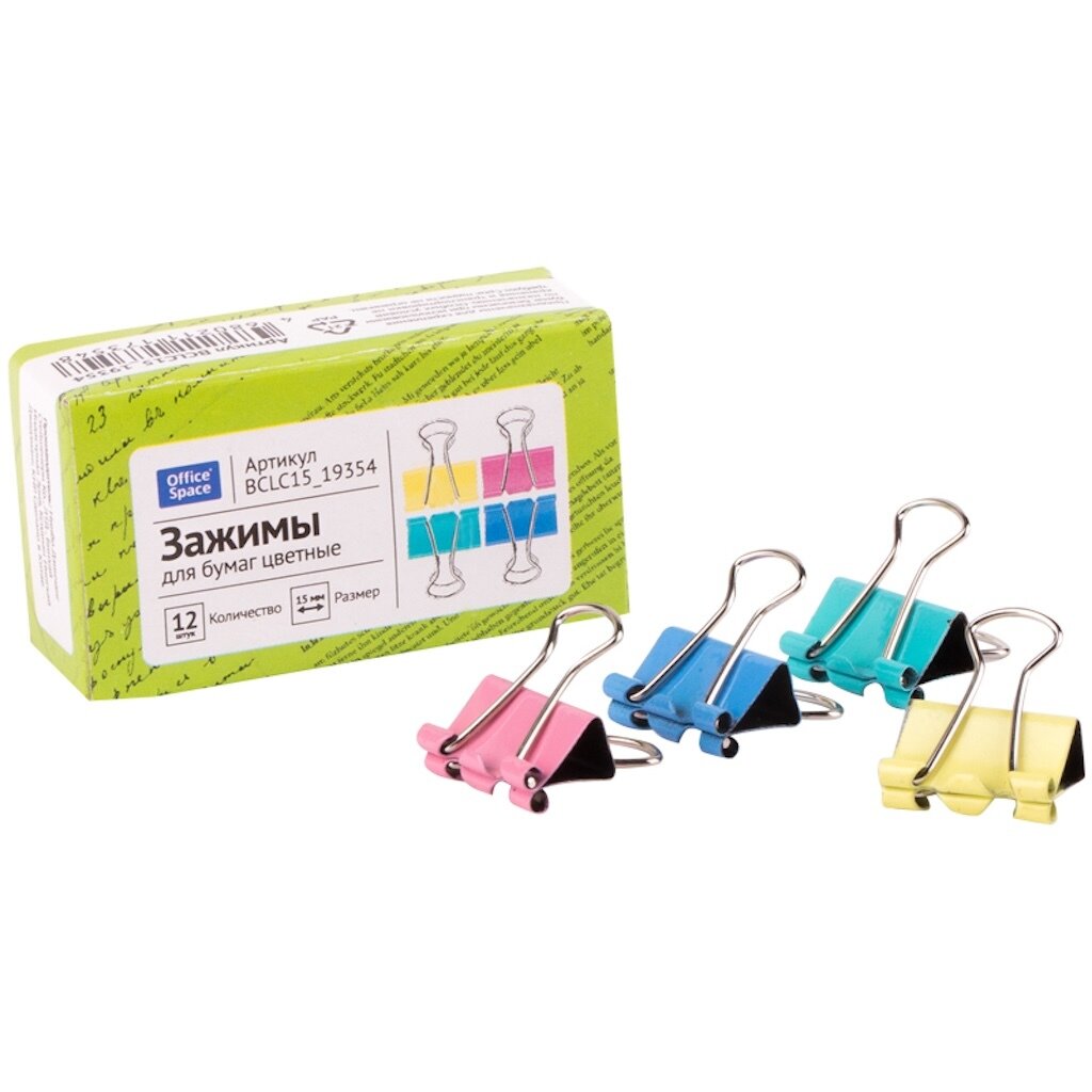 Зажимы для бумаг металлические OfficeSpace (15мм, до 60 листов, цветные) 12шт. (BCLC15_19354)