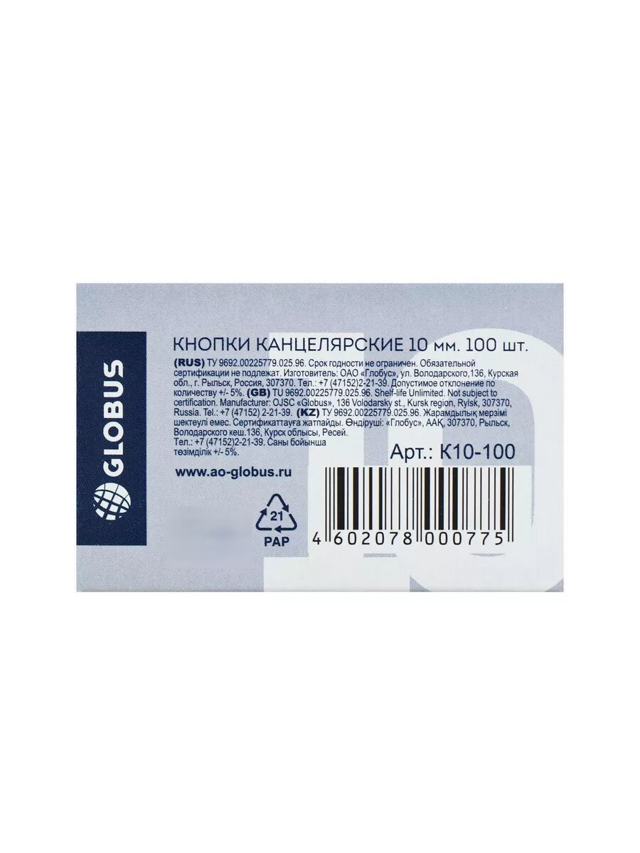 Кнопки канцелярские Globus, 12мм, 100шт., карт. упаковка 4602078001079