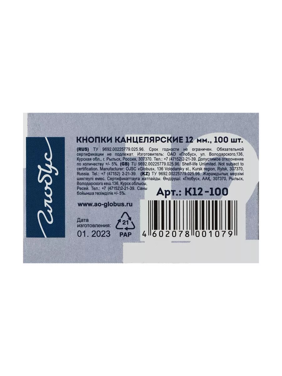 Кнопки канцелярские Глобус К12-100, 12мм, без покрытия, 100шт.в уп,карт.кор
