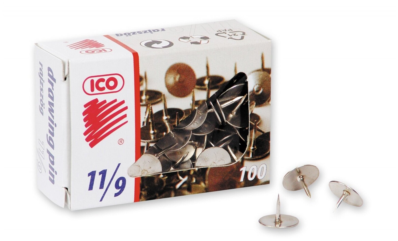 Кнопки канцелярские ICO стальные, 11 мм, стальные, 100 шт. карт.уп