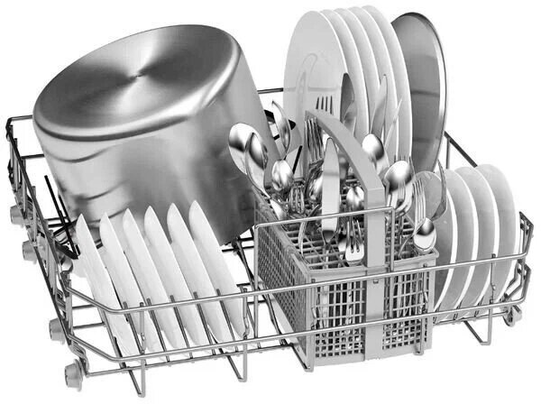 | Минусы: | 1) Сейчас уже не помню модель, но выбирали между этой и машинкой, у которой был отсек для ложек-вилок наверху (третьей тележкой). Она тоже была Бош, но чуть дороже. Я думала, что точно не буду вставлять вилки-ложки в отсеки на нем (и не знала, что их можно просто "накидать"). В общем, жалею - все же "коробка" для вилок-ложек съедает много места.