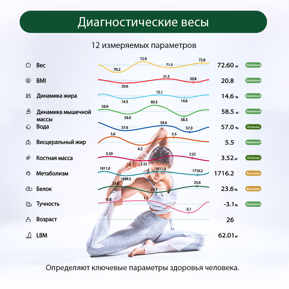 | Дополнительные функции | определение доли жировой ткани / определение доли мышечной ткани / определение доли воды / определение доли костной ткани / расчет ИМТ (BMI) / постановка цели / память |
