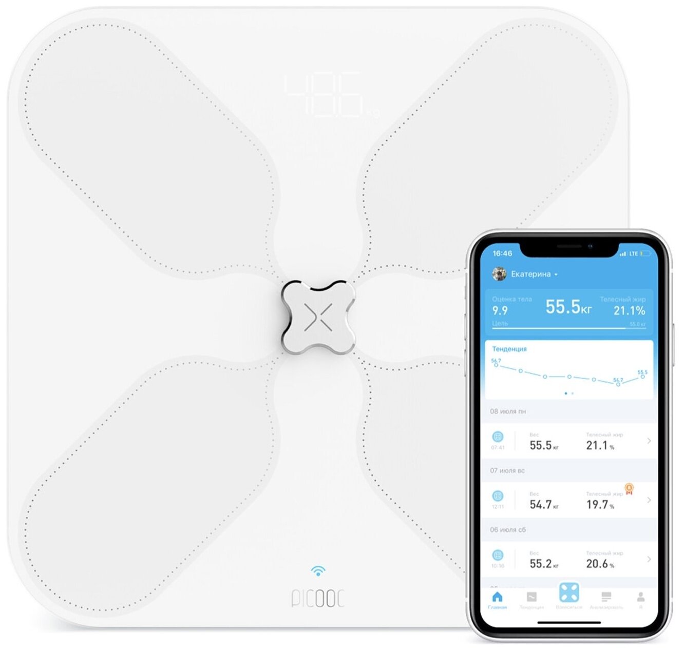 | Плюсы: | Очень красивые весы! Шикарно упакованы. Ощущение, что купили Макбук )) По функционалу все интуитивно понятно. Не возникло никаких проблем ни с подключением к Интернету, ни с синхронизацией с телефоном. Мобильное приложение отличное (только учтите, что оно не русифицировано)! Много всяких измерений. Наглядно, удобно, просто. Взвесились подряд я, муж и наша дочка. Приложение тут же определило, что это три разных человека. Теперь у меня в телефоне есть три профиля. По каждому отдельно будет аккумулироваться информация. |