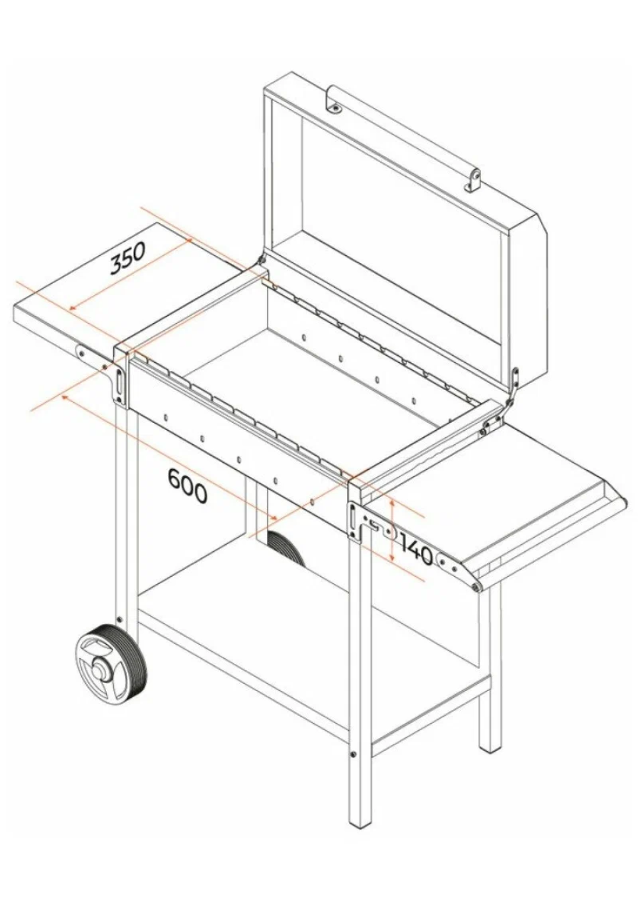 Две полки боковые, одна снизу, плюс зольник. Верхняя крышка с градусником. Гриль на колёсах.