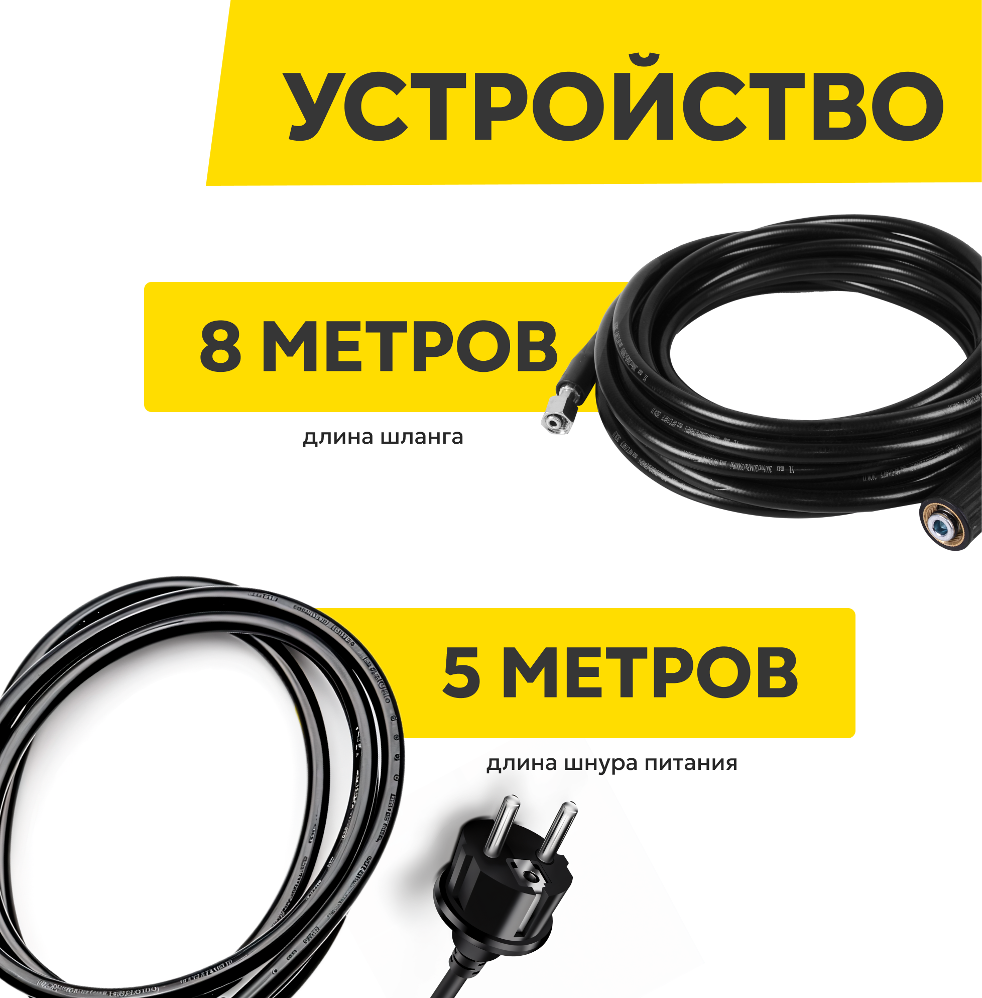 Мойка HUTER W195-QL, 2500 Вт, 195 Бар, 420 л/ч, шланг – 8 м, барабан для шланга, подача воды: водопровод/емкость интересное: