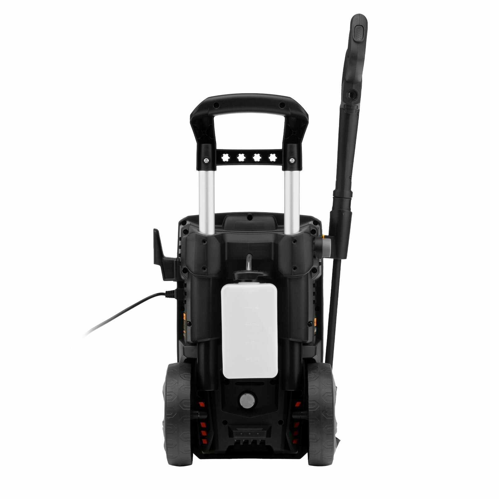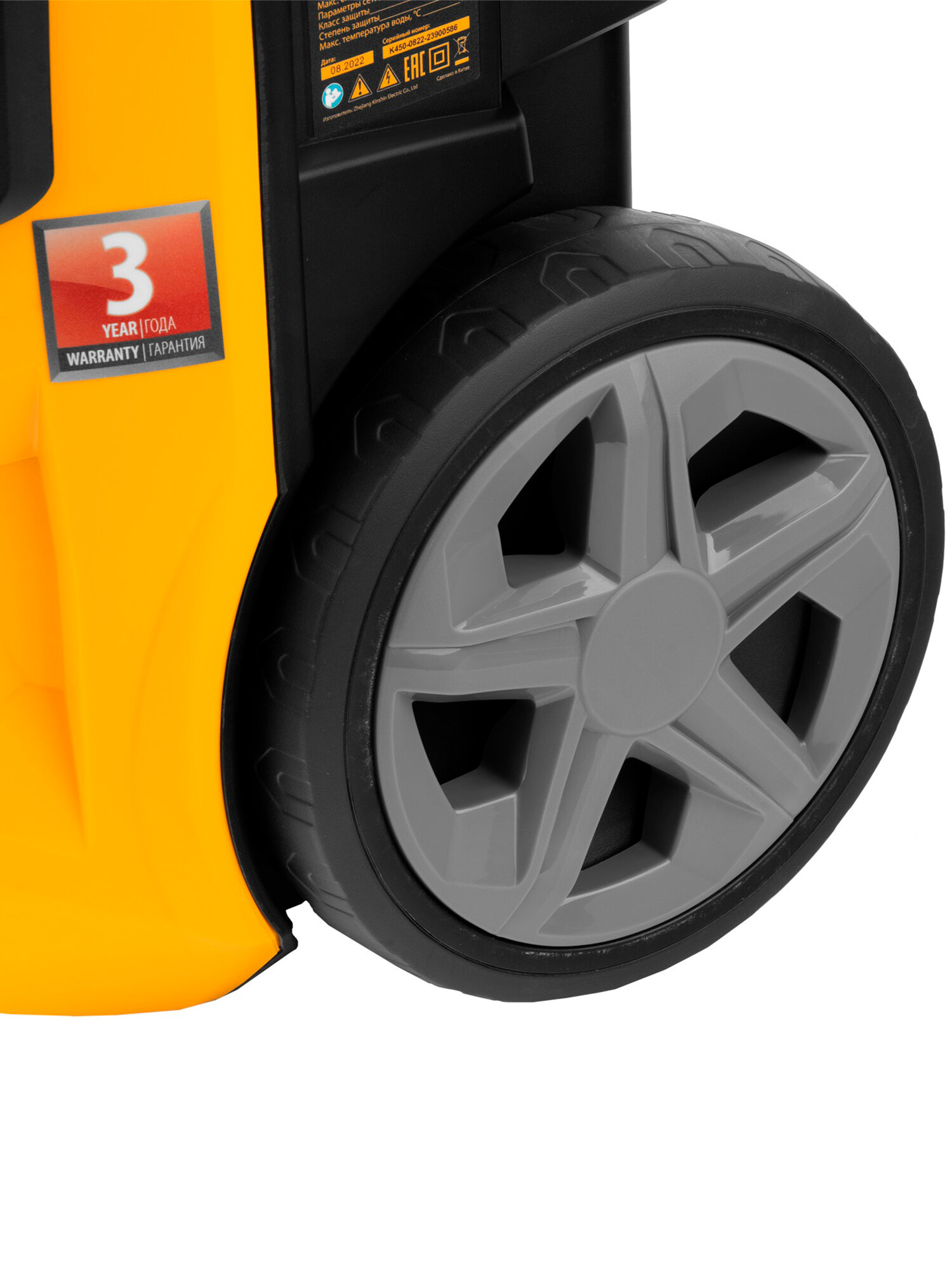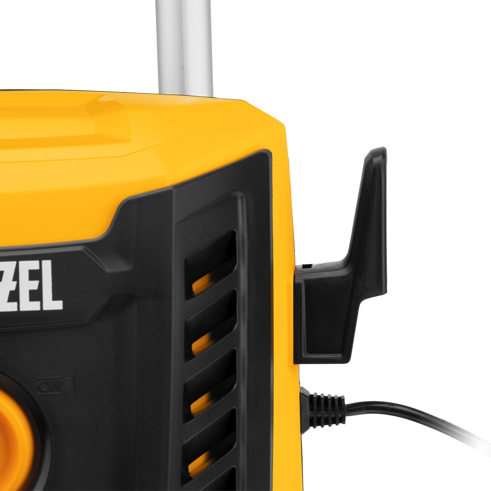 Хорошее давление. Удобная рукоятка пистолета и вращающийся в ней штуцер шланга высокого давления. Съемная штанга из металла. Легкость изменения горизонта струи поворотом сопла. Фильтр во входном съемном штуцере. Есть отсек для хранения штанги и место для намотки провода |