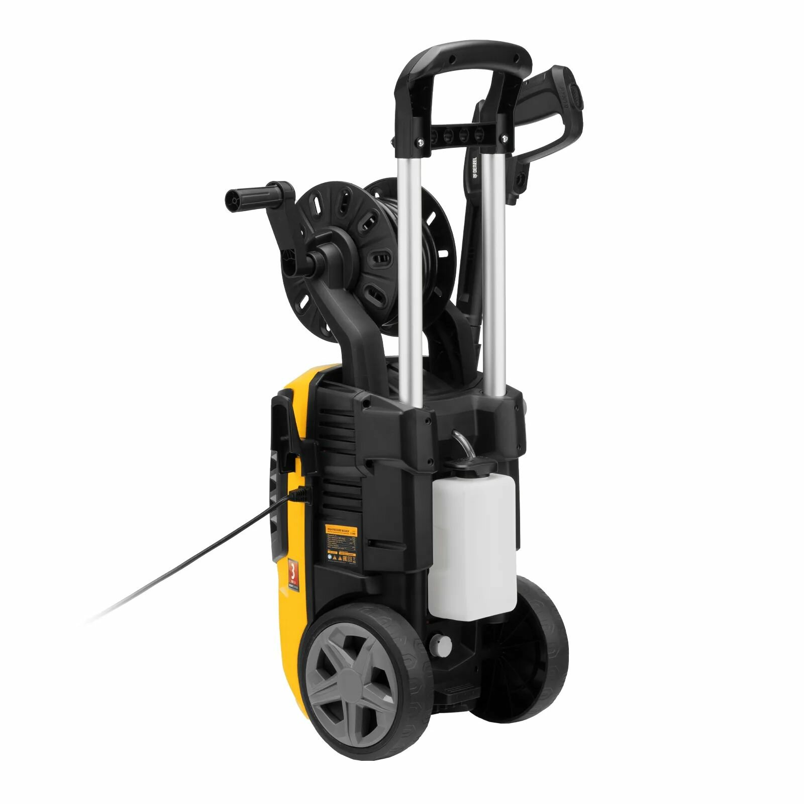 Хорошее давление. Удобная рукоятка пистолета и вращающийся в ней штуцер шланга высокого давления. Съемная штанга из металла. Легкость изменения горизонта струи поворотом сопла. Фильтр во входном съемном штуцере. Есть отсек для хранения штанги и место для намотки провода |