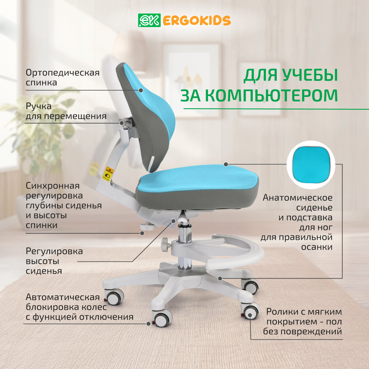 СохранитьРастущее компьютерное детское кресло Ergokids College Y-405 голубое интересное: