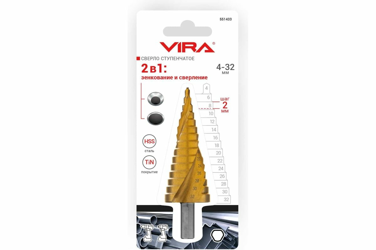 Купить VIRA Сверло ступенчатое спиральное TiN с трёхгранным хвостовиком 4-32 мм 551433