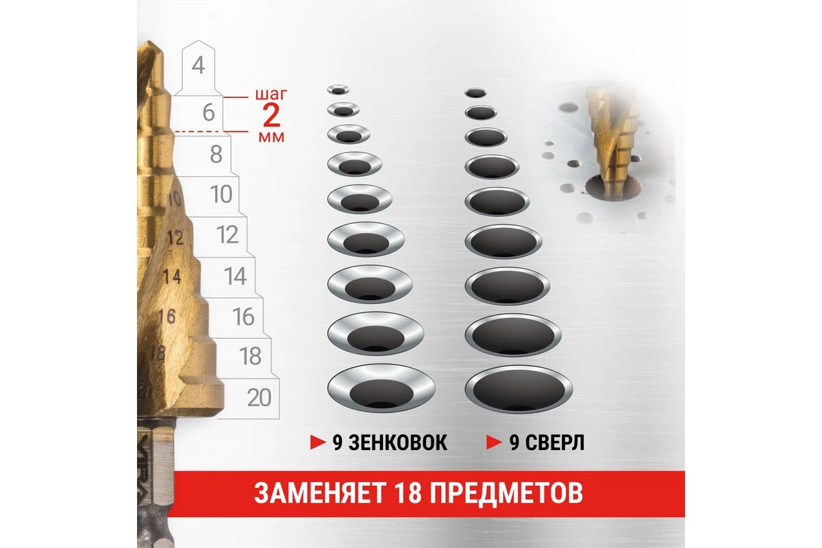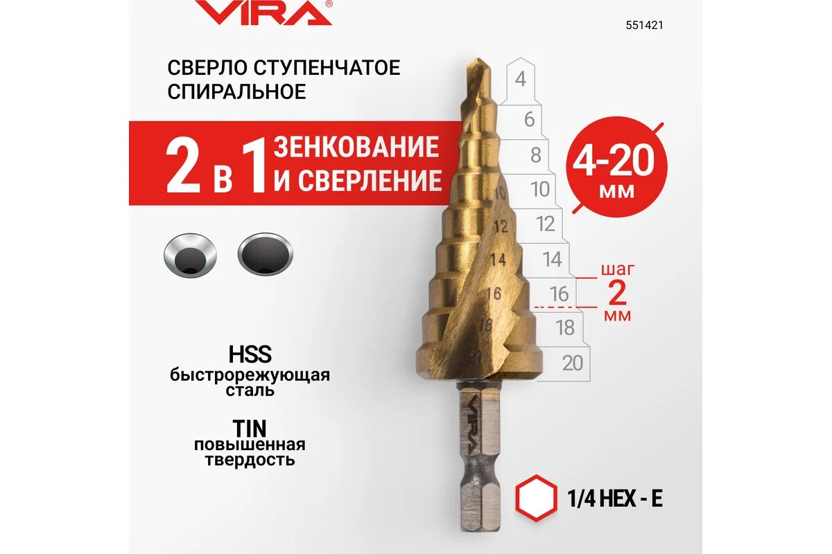 СохранитьVIRA Сверло ступенчатое спиральное TiN с шестигранным хвостовиком 4-20 мм 551421 интересное: