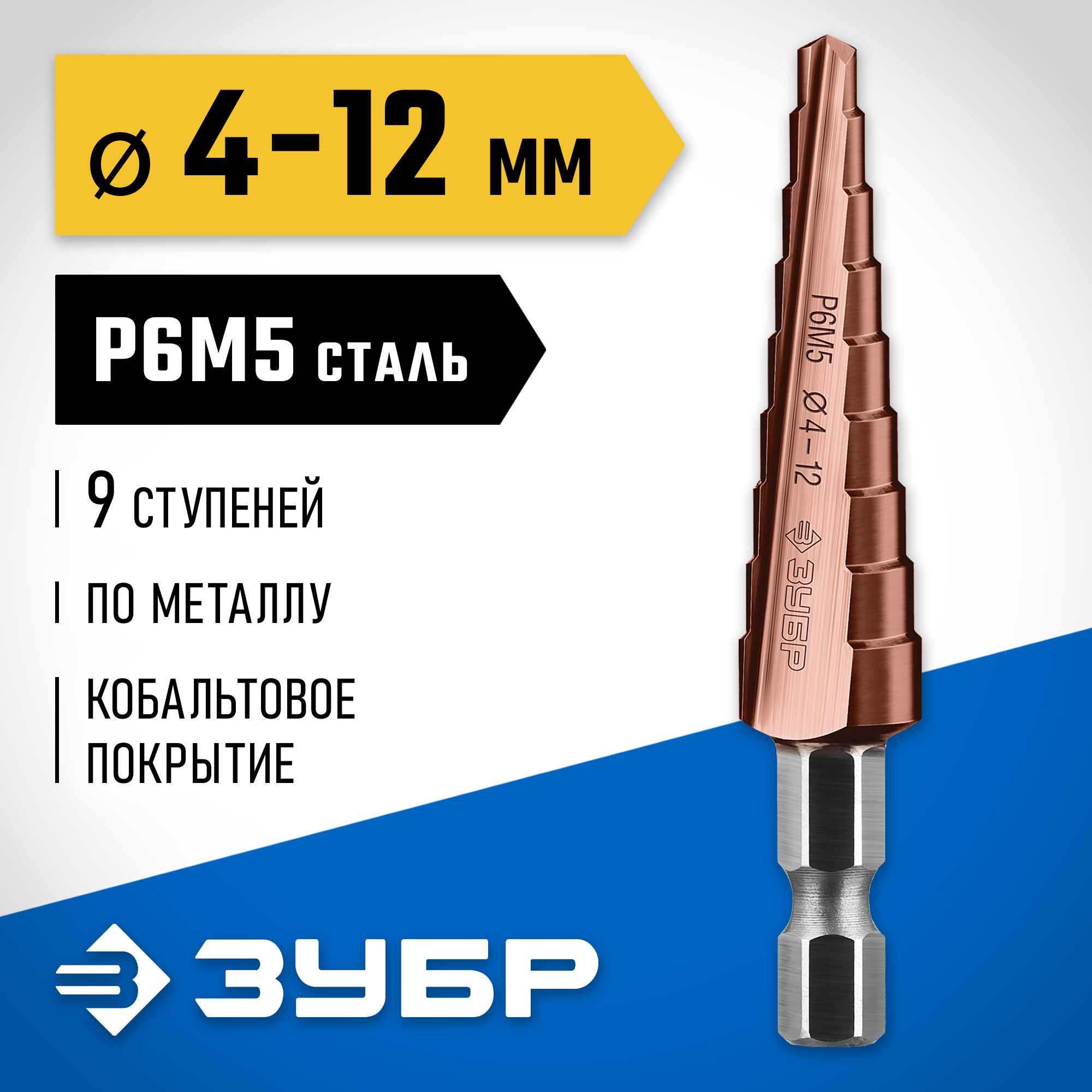 Ступенчатое сверло по металлу ЗУБР Кобальт 4-12 мм, 9 ступеней, сталь Р6М5+Со 29672-4-12-9_z01