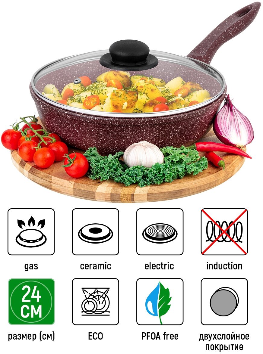 Сковорода глубокая 24 см Elan Gallery гармония вкуса Рубиновый дуэт с крышкой D24, с несъёмной ручкой