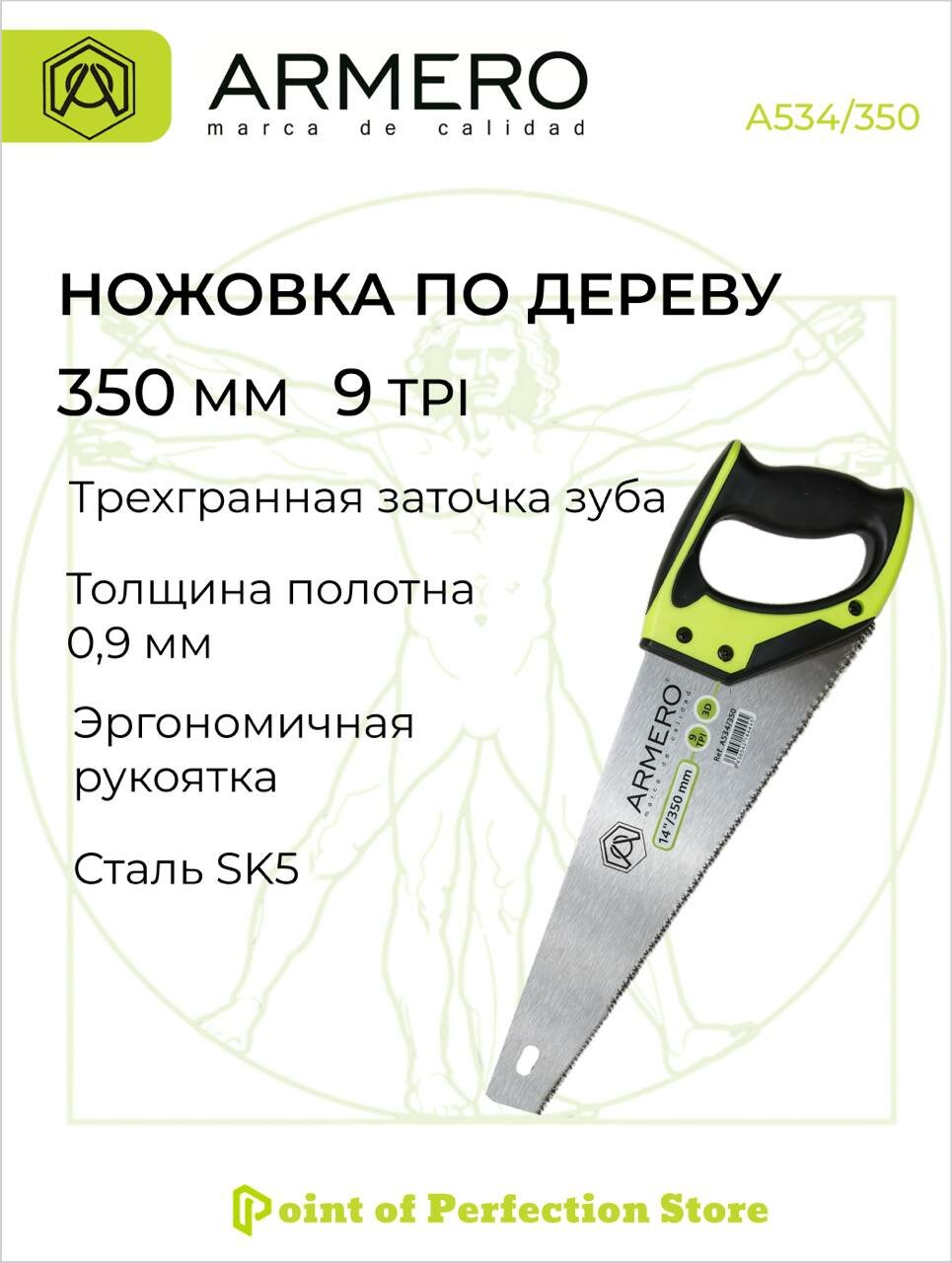 Ножовка по дереву, 350мм, 3d, средний зуб, Armero, А534/350