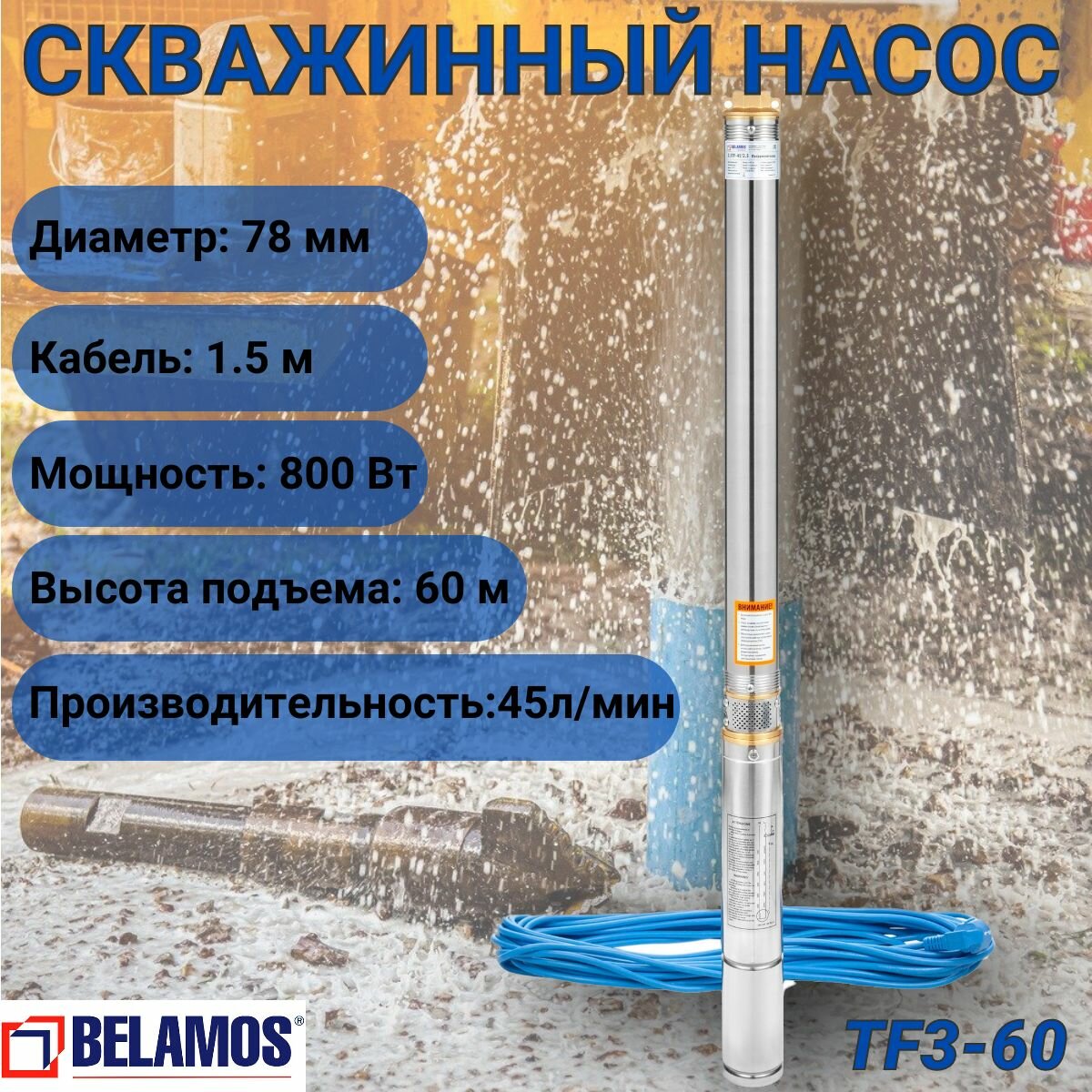Насос погружной скважинный Belamos TF3-60 2,7 м3/час, 45 л/мин, Н-60 м, d-78 мм, каб. 1,5 м. Насос для скважин 10-35м центробежный беламос