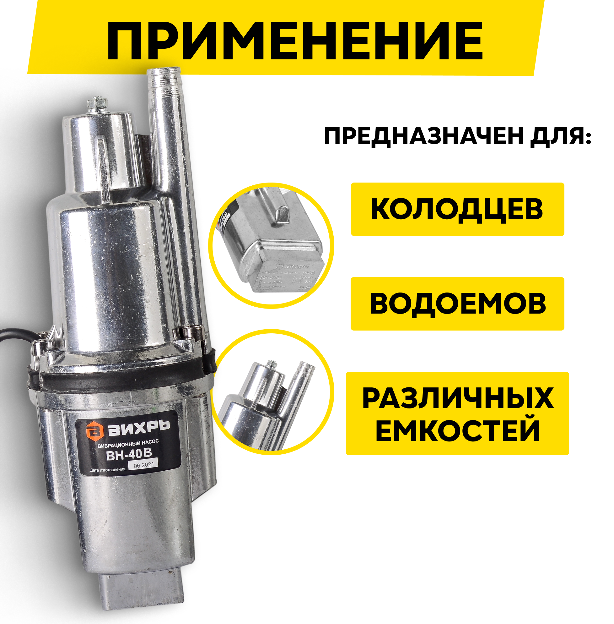 Купить Вибрационный насос ВН-40В Вихрь, высота подъема 72м, верхний забор воды, кабель 40м