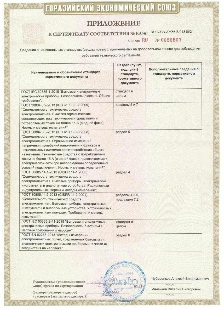 | Дополнительная информация | максимальное содержание в воде механических примесей до 100 гр/м³; максимальная пропускная способность 1,9 м³/час, номинальная пропускная способность 1,2 м³/час; максимальная высота водяного столба 106 м, номинальная высота 49 м |