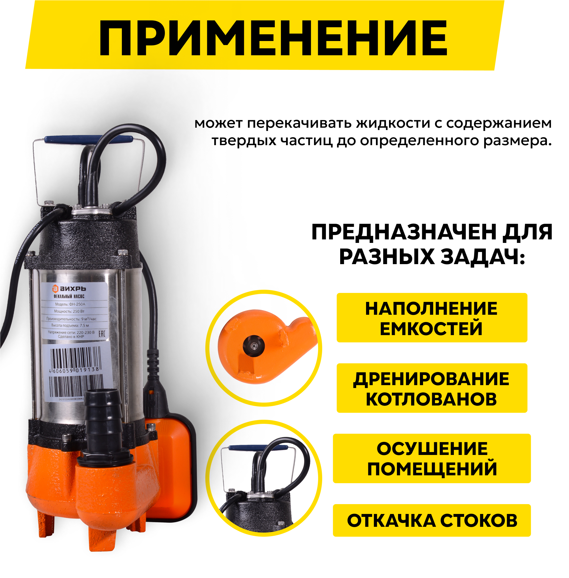 Фекальный насос Вихрь ФН-250А, фекальный [68/5/7]