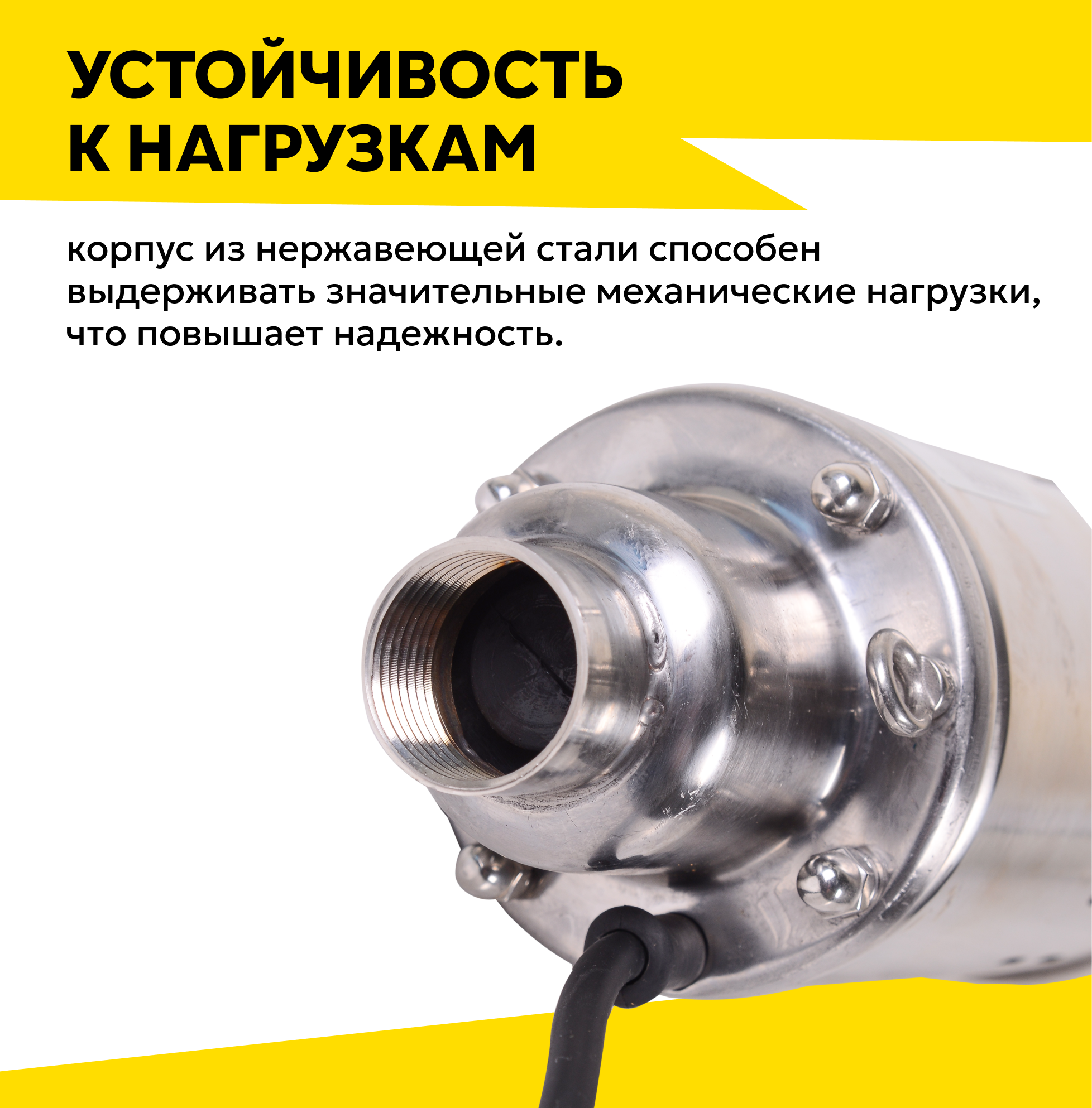 Именно эта модель привлекла тем, что корпус нержавеющая сталь. В действии проверил, действительно мощный с глубины 40 метров воду поднимает без проблем и что еще заметил электроэнергию экономно расходует. Брал для поливки огорода, нормально работает с июня месяца 2021 года. Пока всем доволен, своих денег стоит.