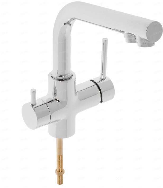 | Комплектация | корпус смесителя - 1 шт, хромированное декоративное кольцо - 1 шт, прокладка - 1 шт, С-образная резиновая шайба - 1 шт, С-образная металлическая шайба - 1 шт, гайка - 1 шт, подводящая трубка-штифт с резьбой - 1 шт, переходник для подключения шланга от фильтра с питьевой водой - 1 шт, гибкая подводка для водопроводной воды - 2 шт |