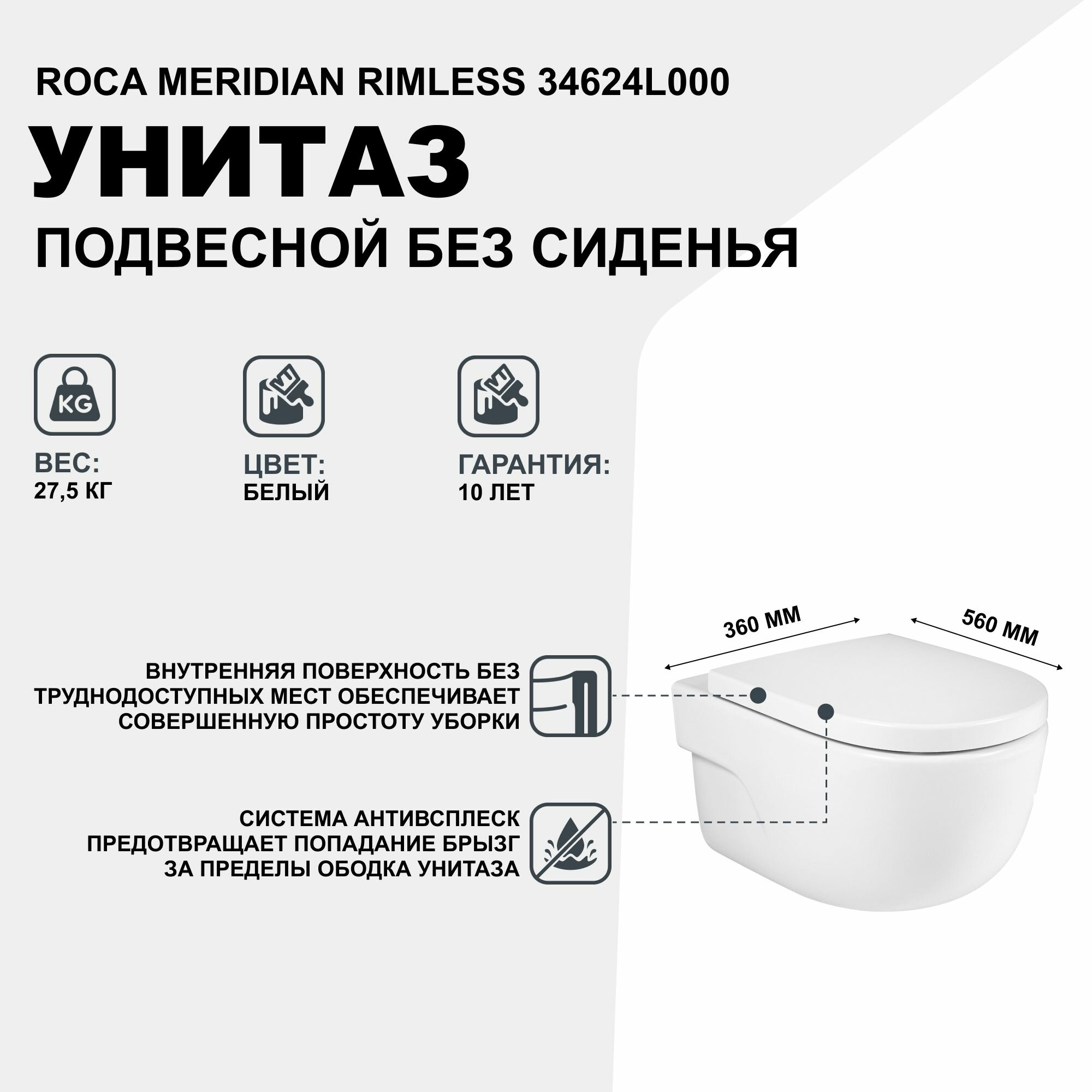 Подвесной унитаз Roca Meridian 36х56см, арт. 34624L000, безободковый, без сиденья