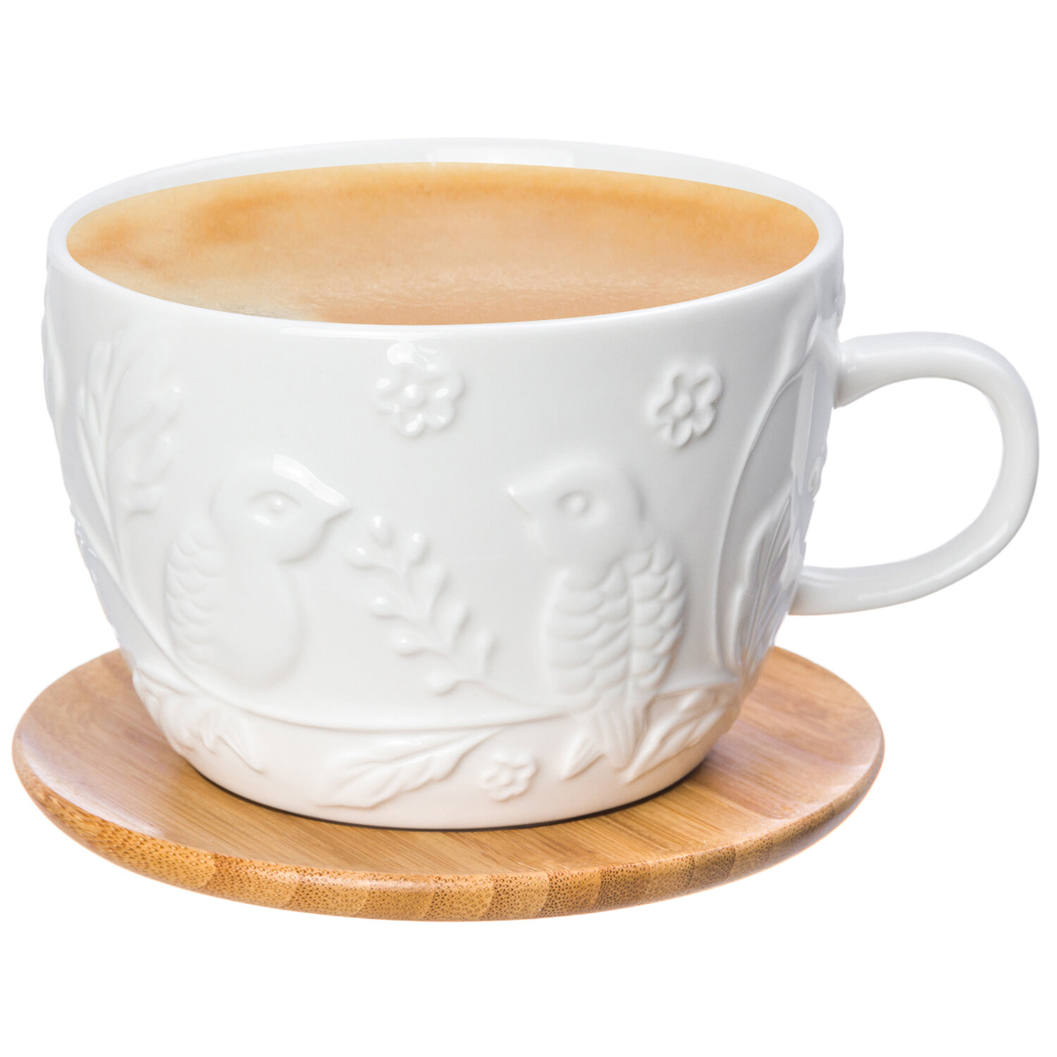 Купить Чашка для капучино и кофе латте Elan Gallery "Птички на ветке" с деревянной крышкой-подставкой, 500мл