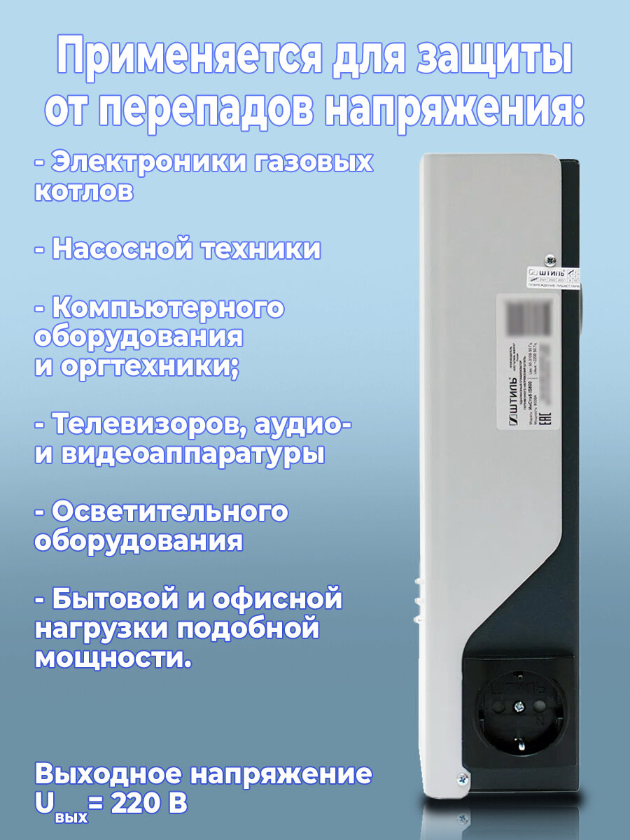 | Плюсы: | Бесшумный, компактный и главное выполняет свою функцию на 100%, покупал его для газового котла Protherm Yaguar, до этого был релейный стабилизатор, при скачке напряжения сгорел, а Штиль работает, скачки бывают иногда, котел работает в обычном режиме, рекомендую именно для котла, так как у него плата нежная, чуть что сразу перегорает, защита нужна и напряжение 220 вольт, которое Штиль выдает постоянно |