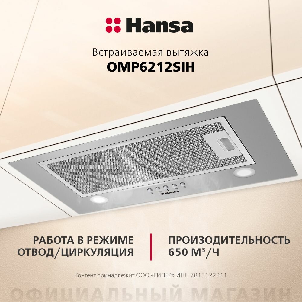 Встраиваемая вытяжка Hansa OMP6212SIH, мощность турбины 650 куб.м/ч, отвод/циркуляция, 3 скорости вентилятора, цвет серебристый